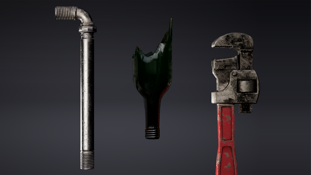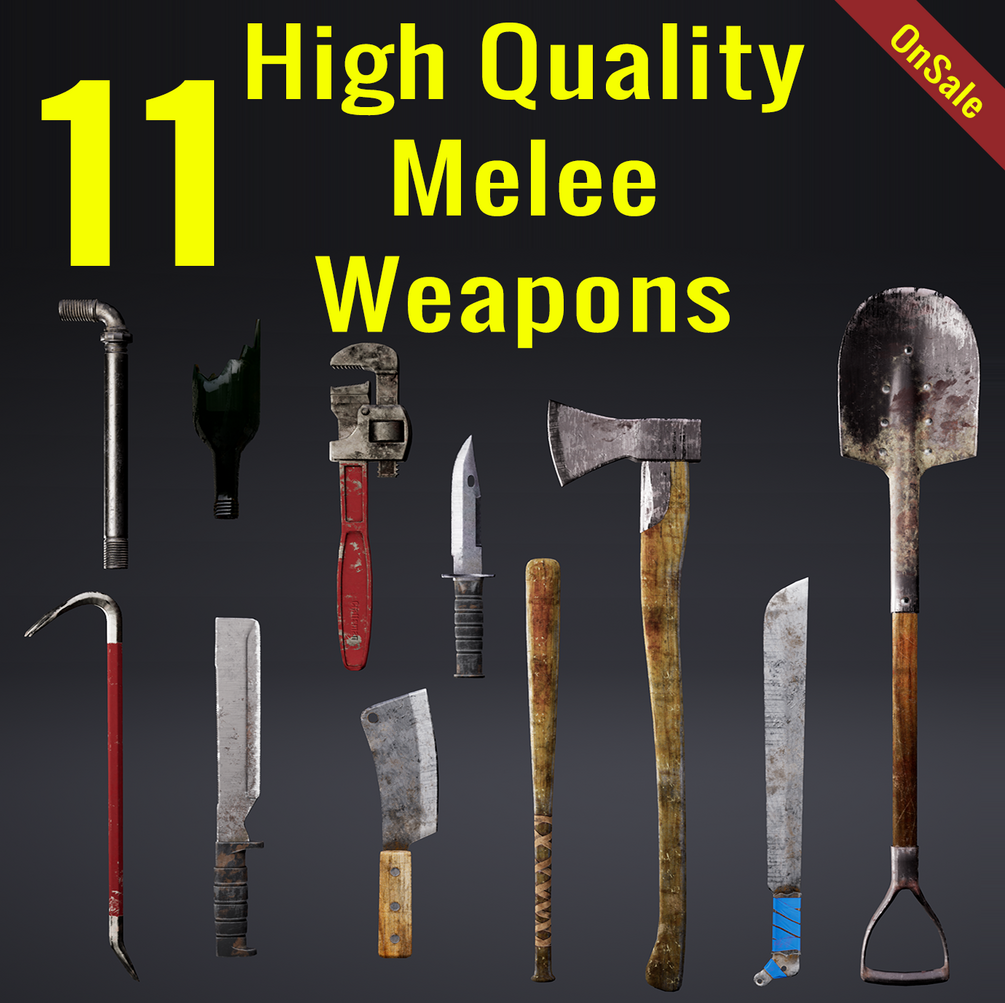 Includes the following Melee Weapons: Baseball Bats, Axe, Combat Knife, Survival Knife, Butcher Knife, Machete, Crowbar, Broken Glass Bottle, Metal Pipe, Monkey Wrench, and a Shovel
